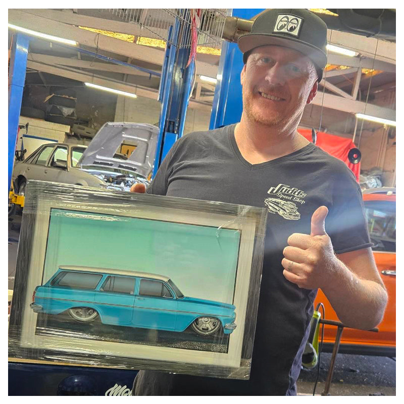 Pictured with the winning framed artwork of his epic PRO EH Station Wagon in the EJ-EH Holden Instagram Car Artwork Giveaway by Geltchy...